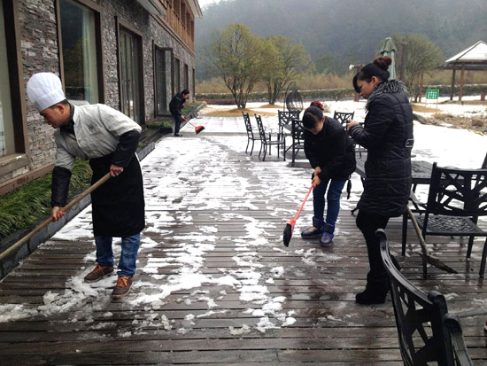 為了保證顧客和員工出入安全,酒店于2月2日上午組織員工掃雪。盡管天氣寒冷,但全體職工熱情高漲、干勁十足,大家團結(jié)合作,在短短2個小時內(nèi)已將酒店門前后院的積雪清理干凈。