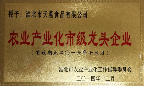 熱烈祝賀淮北市天燕食品有限公司被淮北市農業產業化工作委員會評為“農業產業化市級龍頭企業”。