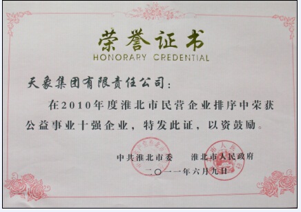 2010年度淮北市民營企業(yè)益事業(yè)十強企業(yè)榮譽證書