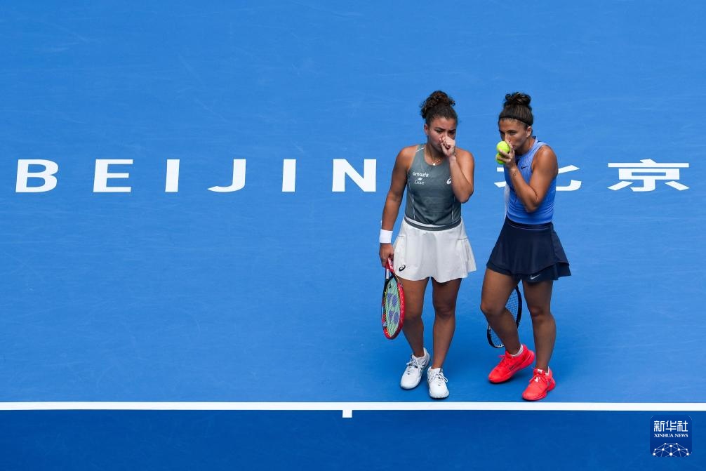 10月4日,埃拉尼/保利尼左)在比赛中交流。当日,在北京举行的2025中国网球公开赛女双半决赛中,意大利组合埃拉尼/保利尼2比0战胜谢淑薇中国台北)/奥斯塔彭科拉脱维亚)组合,晋级决赛。新华社记者 那