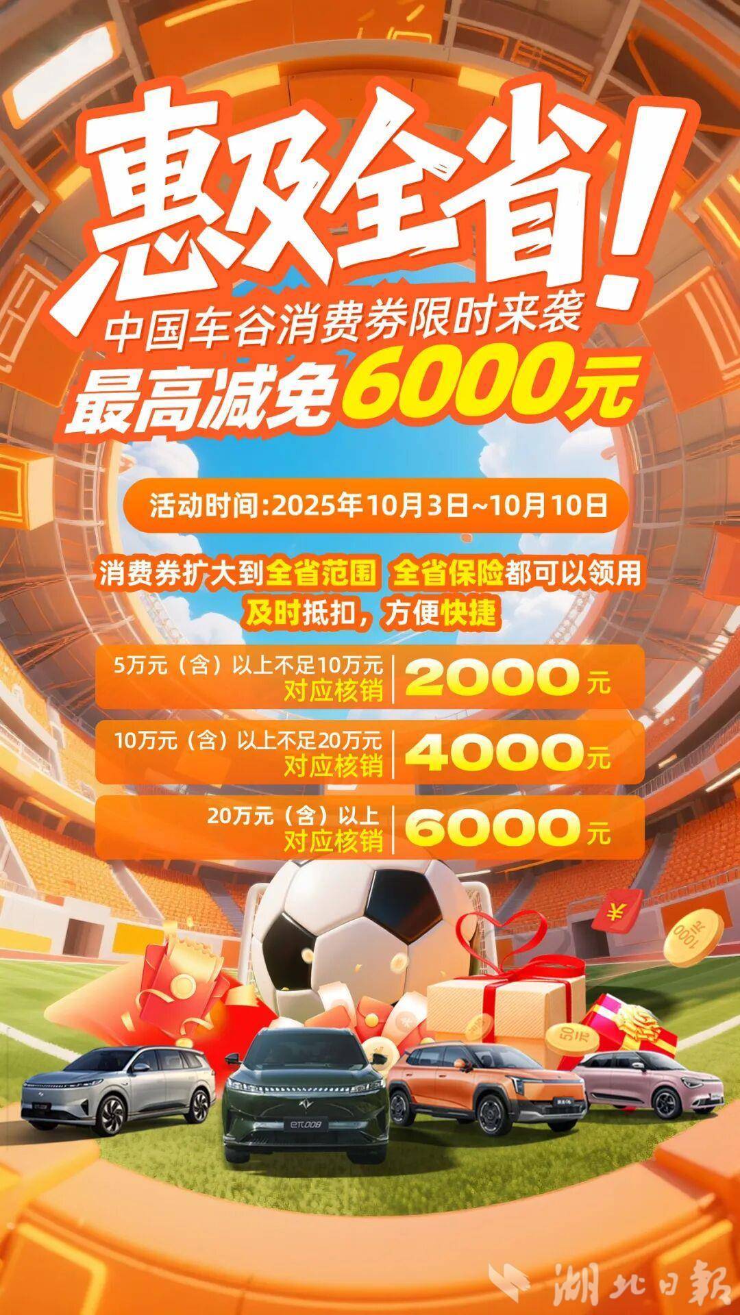 湖北日报讯记者汪洋、通讯员蒋秋雨、杨玉立)从武汉经开区获悉,即日起至10月10日,中国车谷品牌运营中心推出汽车消费黄金周全省让利活动,消费者购买“车谷造”相关品牌车型,最高可减免6000元。本次活动以